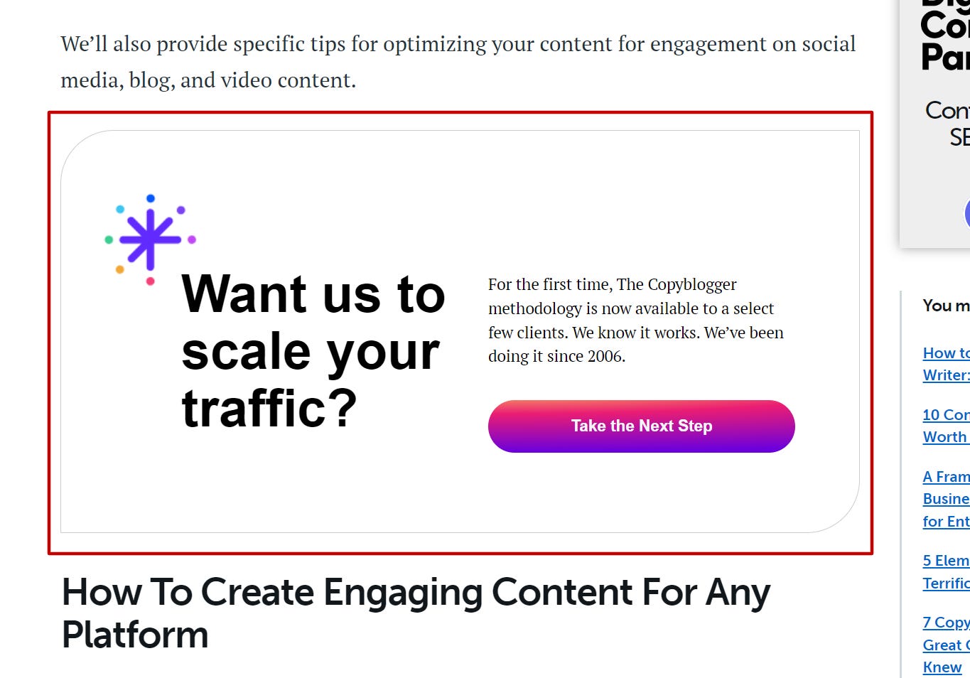 Every blog post published on Copyblogger is published with a call to action that also collects leads for our agency.