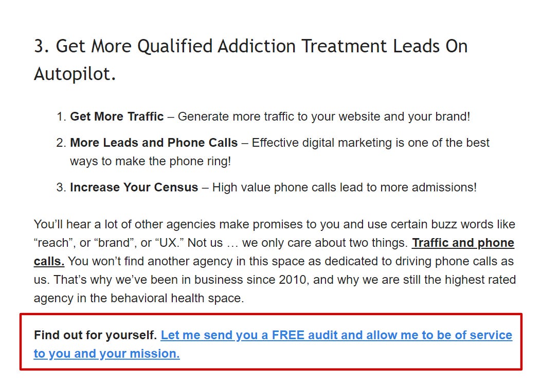 When people click on the link, they get sent to a landing page I created specifically for these types of deals. The landing page is on treatmentleads.net.