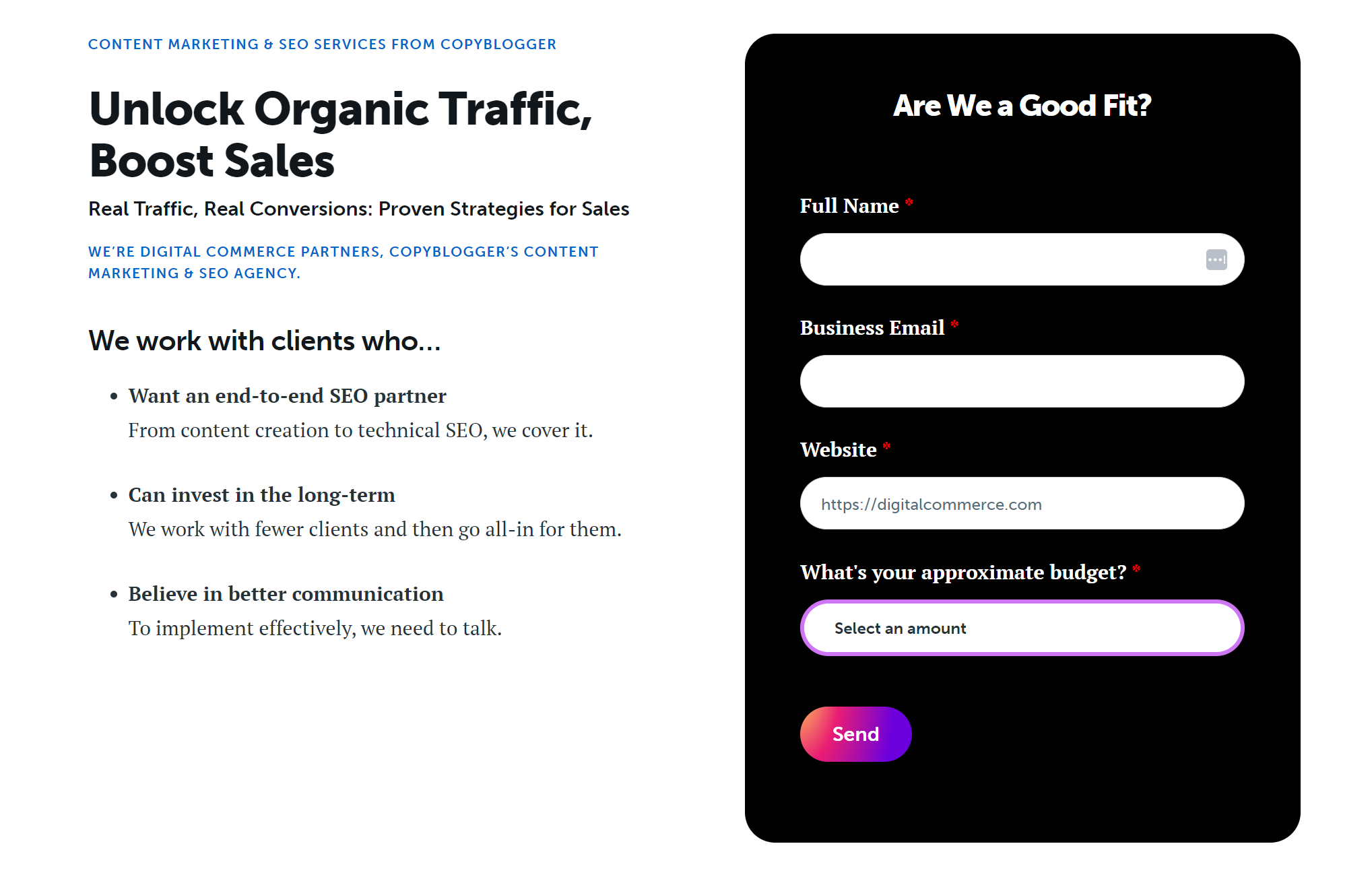 When people click on the button, they get sent to a landing page that is very similar to the one I created for TimStodz.com. Except these leads are for Digital Commerce Partners, which is my content and SEO agency attached to Copyblogger.