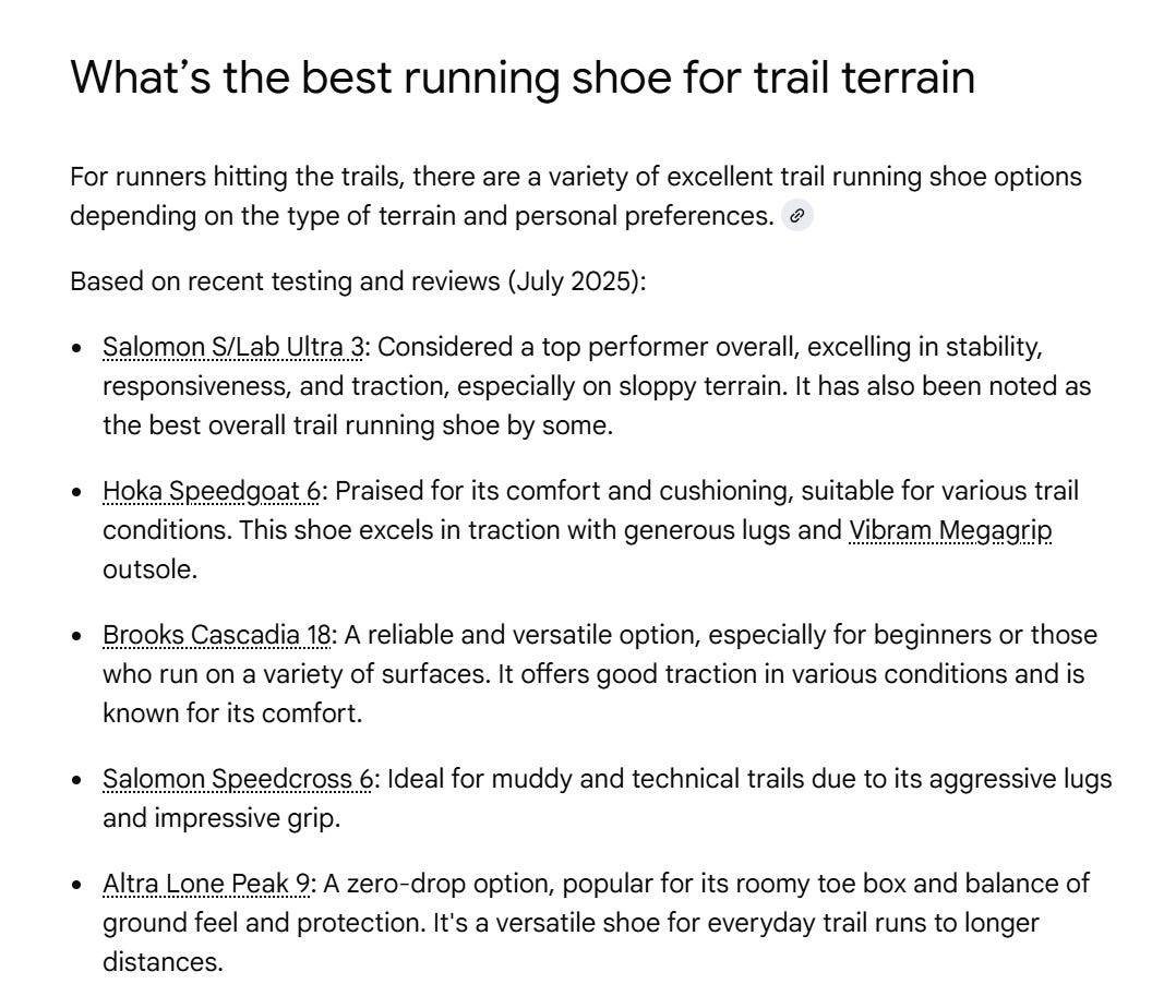 Google is now allowing businesses to advertise directly inside AI Mode. For example, let’s say you go to Google and search “what’s the best running shoe for trail terrain?” AI Mode serves you a list of running shoes.