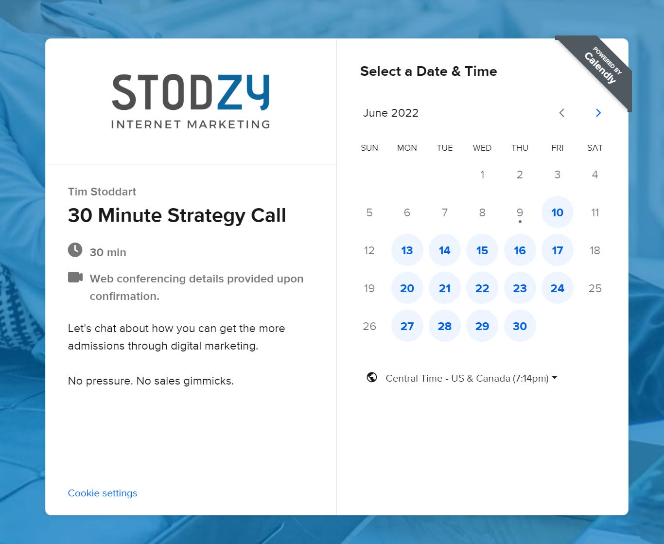 There is a link to book an appointment at the bottom of every email. That link goes to a page with an embedded Calendly link where the prospect can book an appointment with me.