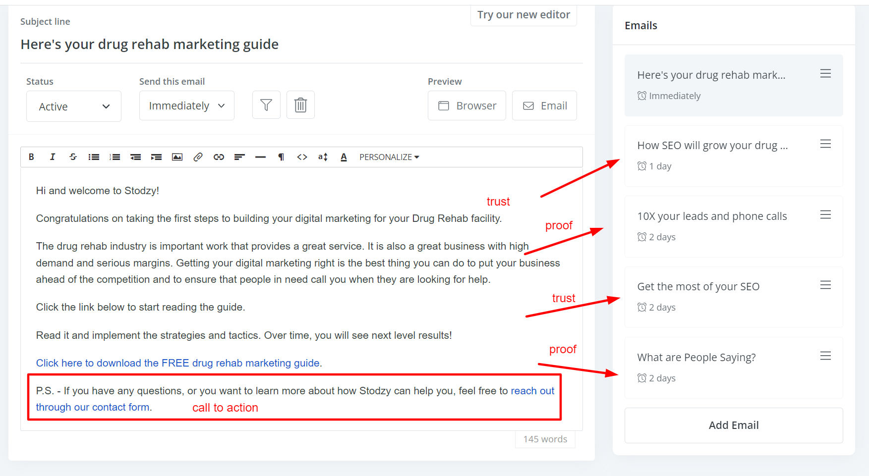 The email automation rotates back and forth between sending them messages of trust and proof.