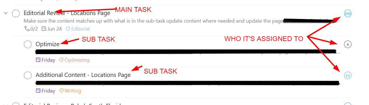 For instance, let's imagine we have a new piece of content to write. The main task might look something like "Publish article X on Y website." That task will have instructions in the description.