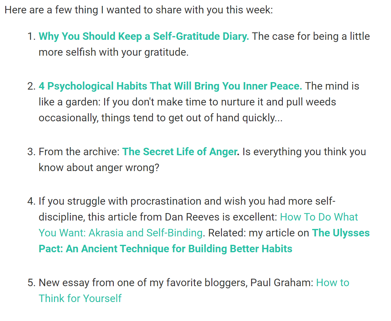 The weekly email I receive from my friend Nick is a great example. Each week, he sends me awesome articles that are useful but are also in line with his brand and his message. Nick is a clinical psychologist and his content always helps me think better.