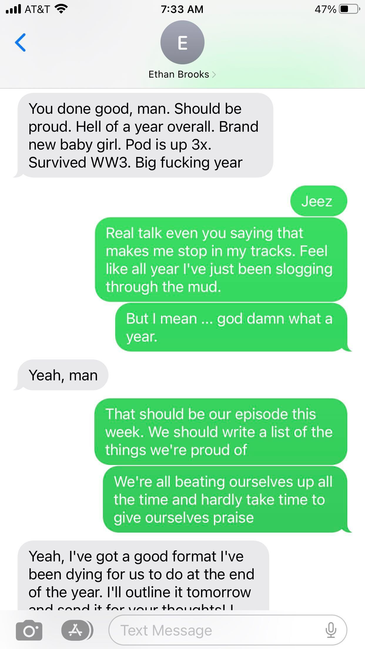 I was texting back and forth with Ethan last night. We were chatting about ideas for the podcast and eventually we took a moment to reflect on the year.