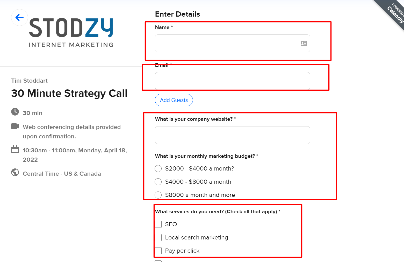 In addition, I have built a qualifying form that ensures people who book appointments are serious prospects who have a real interest in hiring us and can afford it.