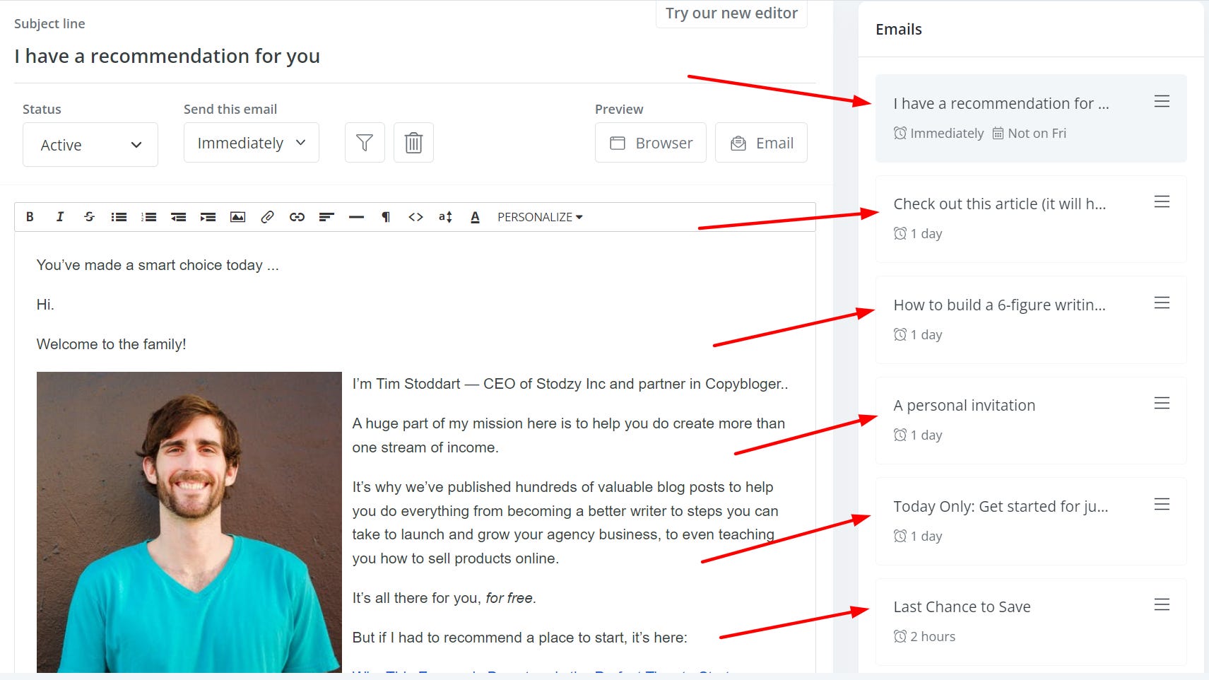 Here's is a screenshot of what my automation looks like. Every one of these emails drives traffic to the sales page.
