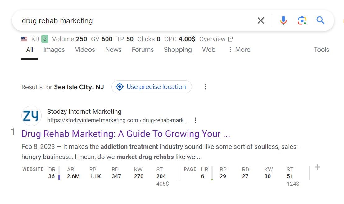 For example, I rank #1 for the keyword “drug rehab marketing.” Because of how specific that search query is, I’m only ever going to generate traffic from people who are specifically looking for (you guessed it) a drug rehab marketing company.