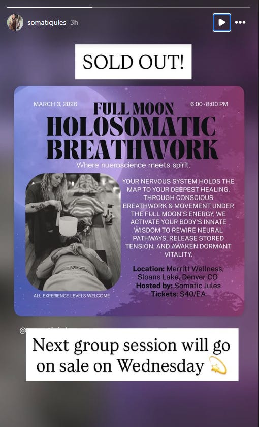 Somatic Jules: This is my wife’s Substack. For the record, this is all her, and I don’t claim any credit for the ridiculous amount of success she is having. She uses her Substack to sell tickets to her events and will eventually build out a retreats business.