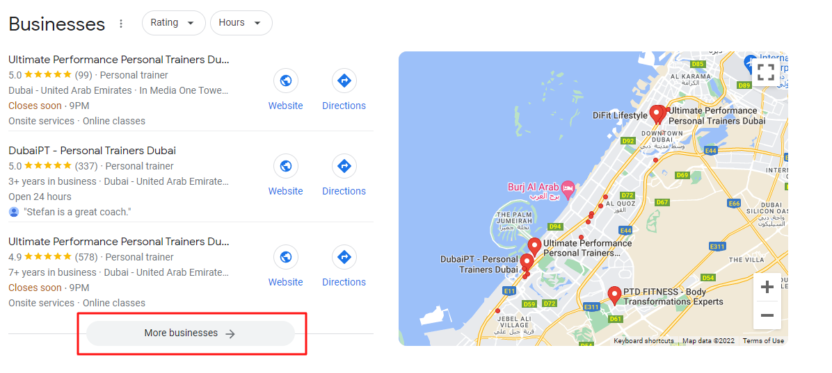 Let's imagine you Google "personal trainer in Dubai", you will see the top three listings and the link for "more businesses." See an example below.