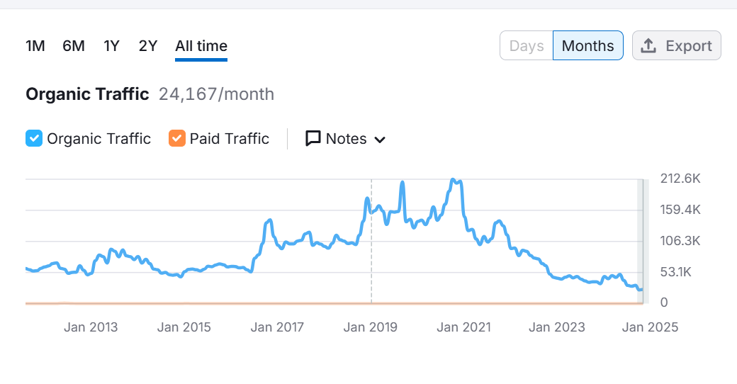 Here’s the thing. I don’t think onsite SEO is as powerful as it used to be. Traditional content marketing doesn’t generate inbound search traffic the way it used to. If you want proof, just take one look at the inbound traffic from Copyblogger over the last four years.