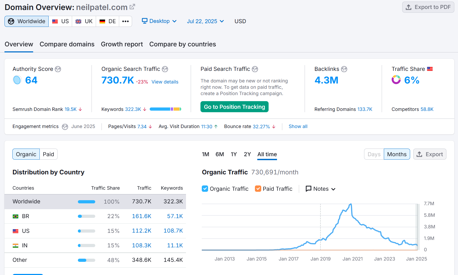I’m sad to say that this type of search is definitely being eaten up by AI. If you don’t believe me, look at the search traffic for Neil Patel, one of the most successful SEO driven sites and businesses in history.