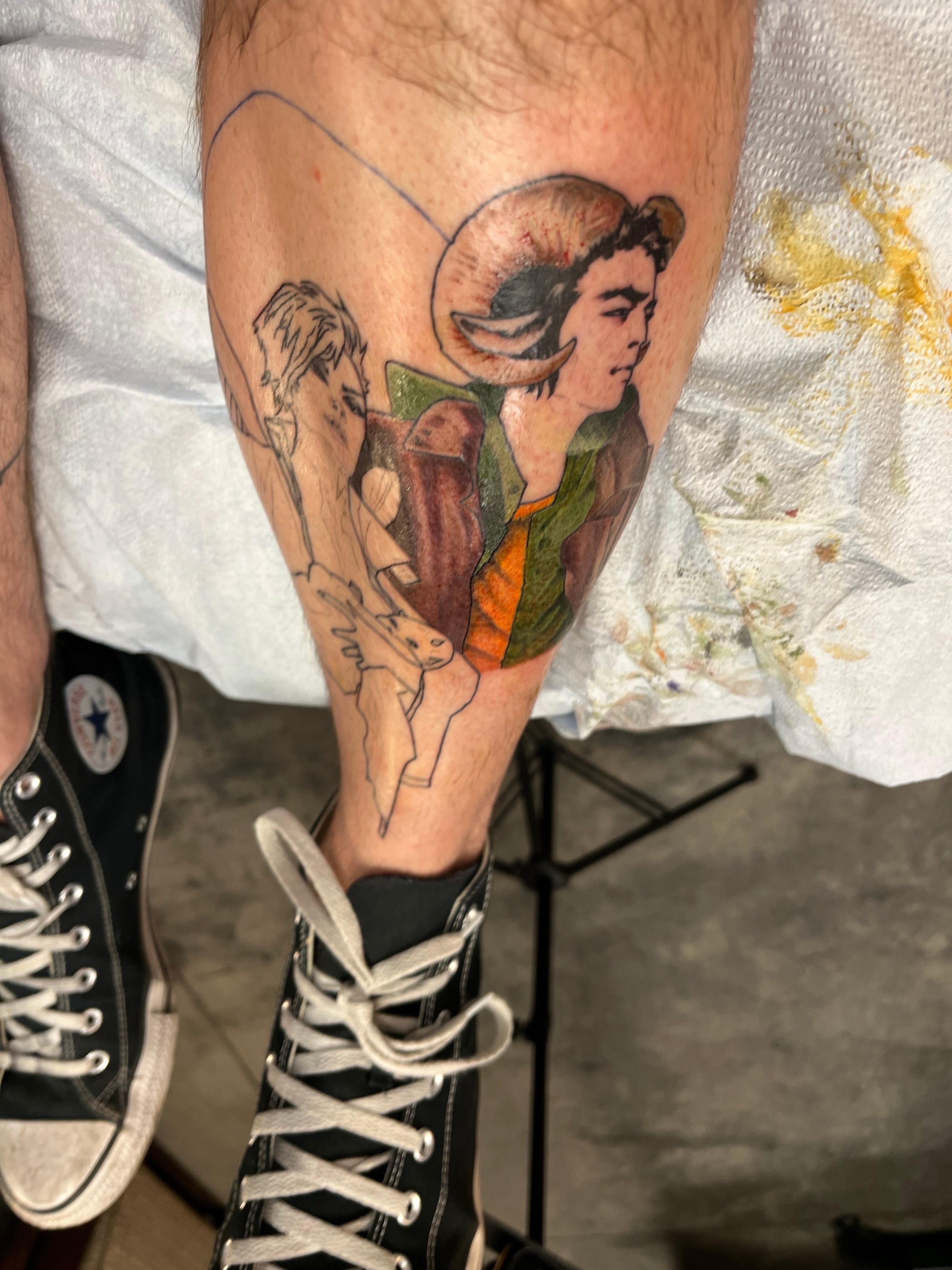 This tattoo is taking forever. I think the coloring style of the original artist makes it so that every section of the color needs to be done in layers. For instance, the purple section took two hours alone. It sucks.