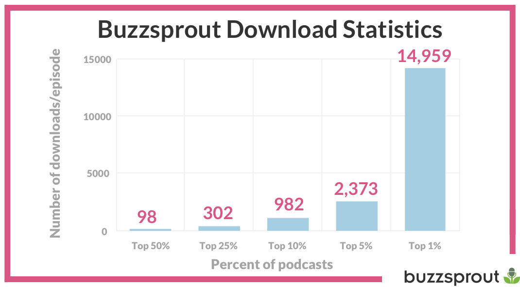 Advertisers typically pay $15 per every 1000 downloads. Buzzsprout has reported some staggering numbers in podcast downloads. 50% of podcasts only get 98 downloads per episode.