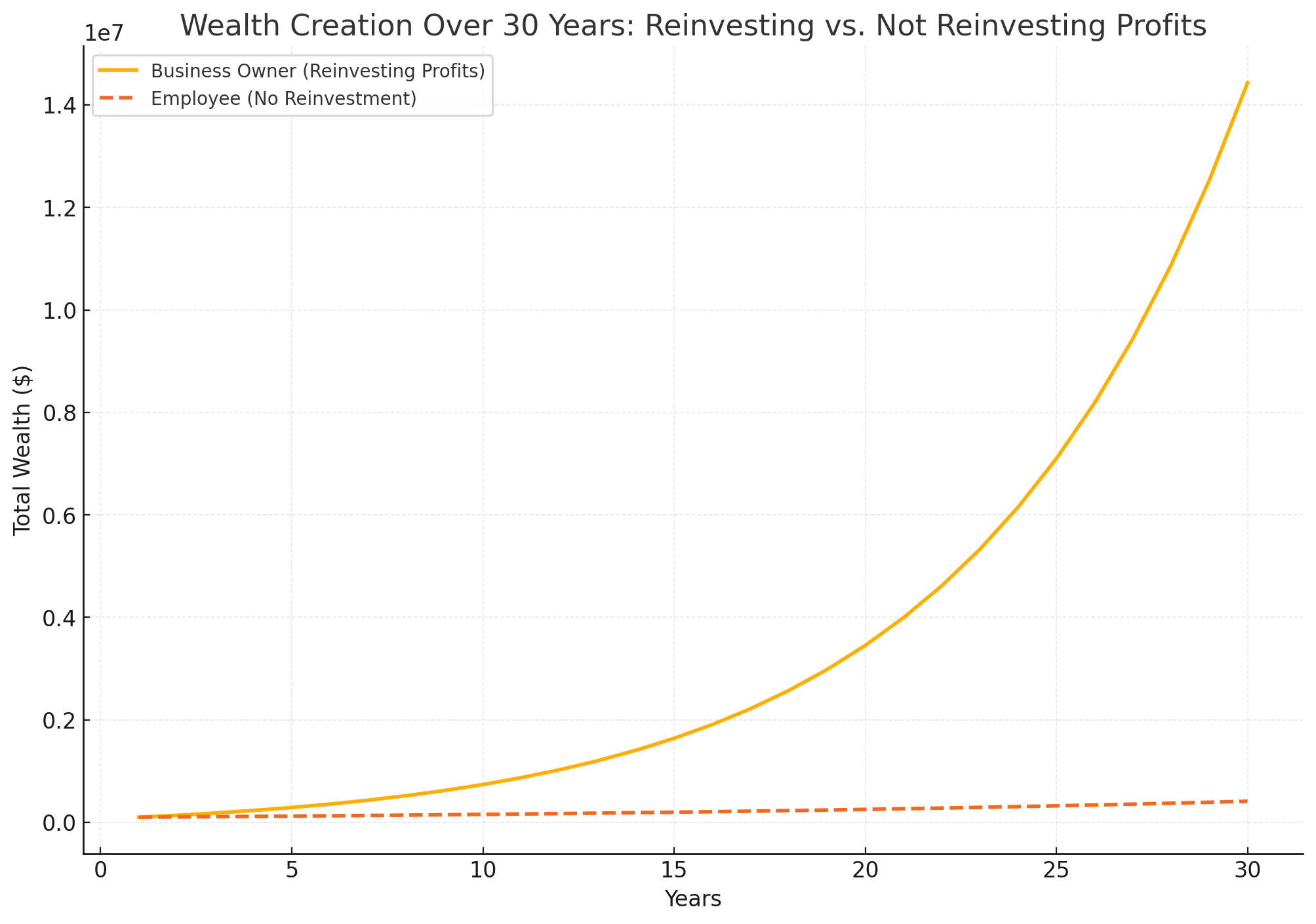 Two people each make $100,000 a year. The business owner reinvests profits and earns a 15% annual return, while the employee relies on a 5% annual raise. Over a 30-year period, the business owner’s wealth skyrockets while the employee’s remains relatively flat.