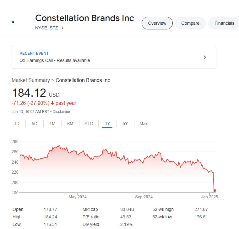 Constellation Brands: Known for brands like Modelo and Corona, Constellation Brands reported disappointing fiscal third-quarter earnings, missing sales estimates, and reducing its fiscal-year outlook. The company saw a 16% drop in stock value following the earnings report.