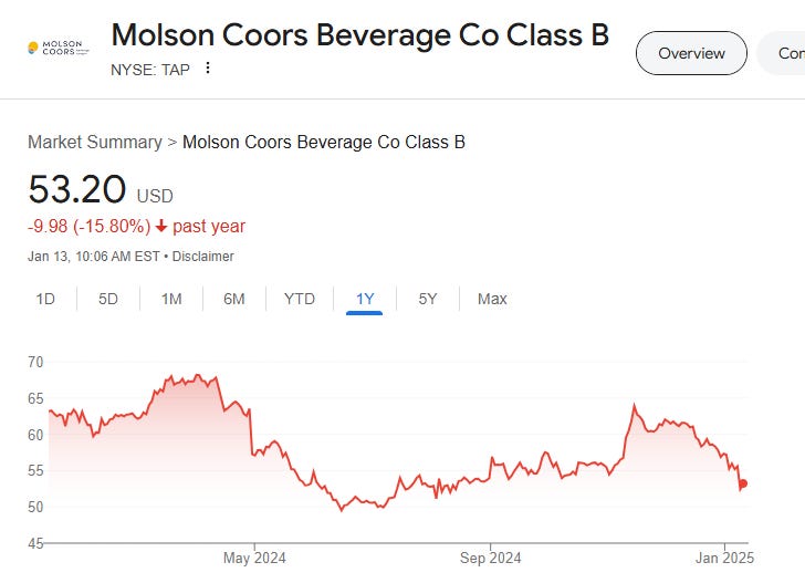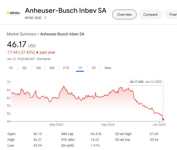 Anheuser-Busch InBev (AB InBev): The producer of Budweiser and Bud Light has faced declining sales in key markets. In 2024, AB InBev experienced a 21.4% drop in Bud Light sales, with other brands like Budweiser and Grupo Modelo also seeing declines of 11.4% and 4.4%, respectively.