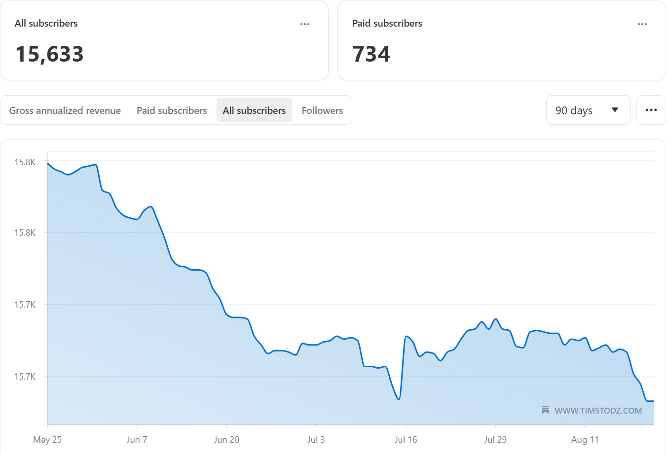 This is also because I haven’t been recording and publishing YouTube videos, which is where a lot of my subscribers come from. Once Tim Stodz Media officially kicks off on September 1st, I expect to see more growth.