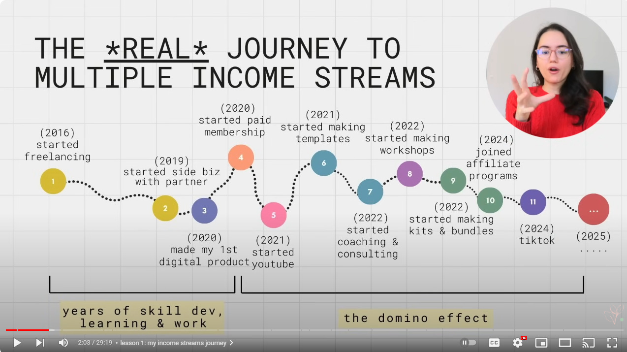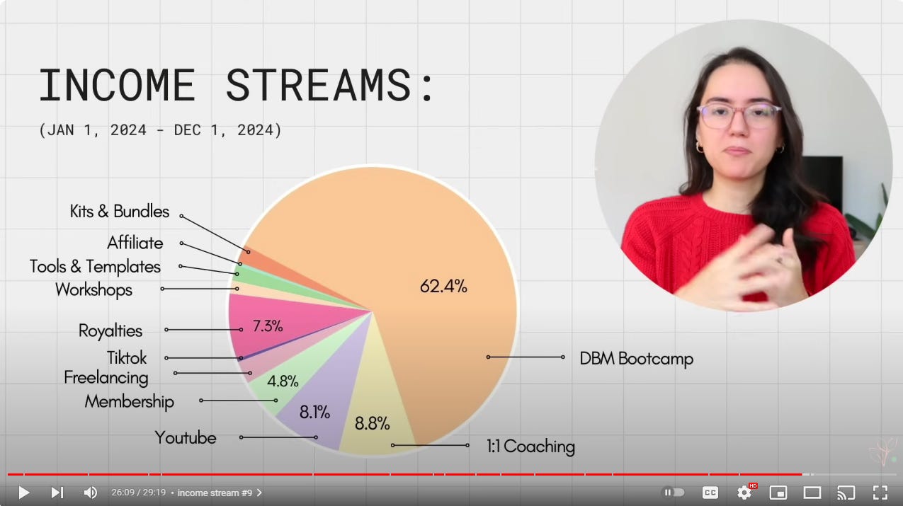 In Deya’s case, her other revenue streams are actually distracting from her main income source. For example, if she stopped focusing on YouTube sponsorships and put that effort into fully promoting her Bootcamp, she would likely earn much more.