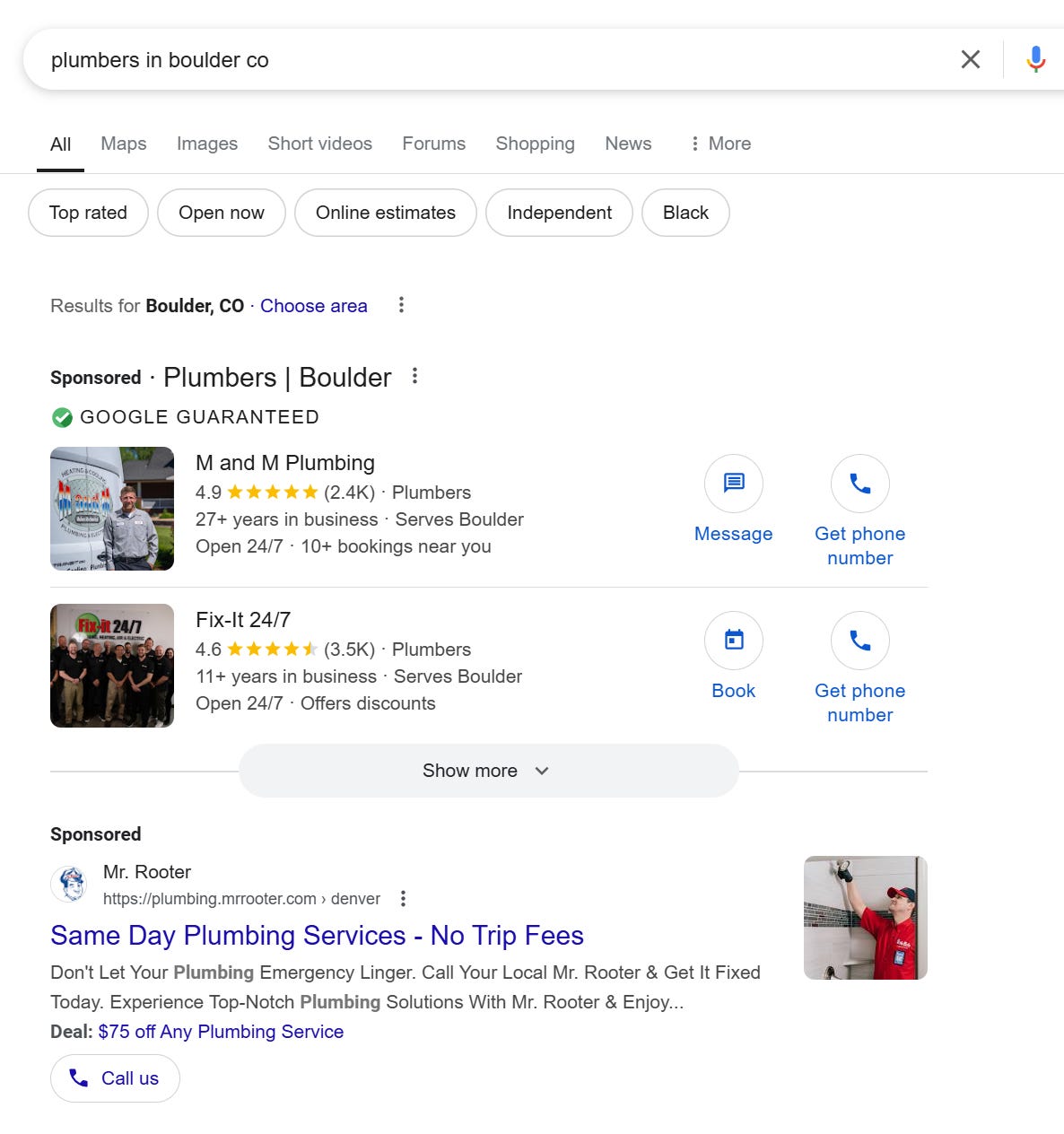 When I search “plumbers in Boulder CO,” I get two Google Business Profile ads and another ad. If you keep scrolling, you’ll see all local organic results.