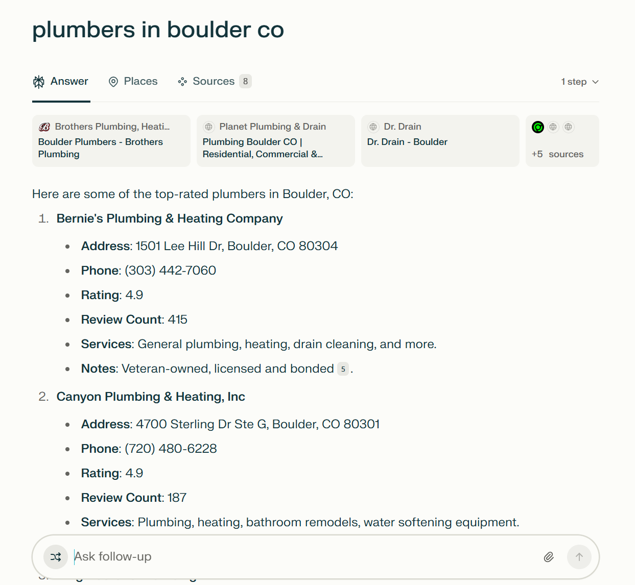 For example, if you go to Perplexity and search for “plumbers in Boulder,” you’ll get a few bullet points of results. But the information lacks the richness and detail of Google Business listings. That’s because Google owns that database and has spent decades collecting information directly from business owners.