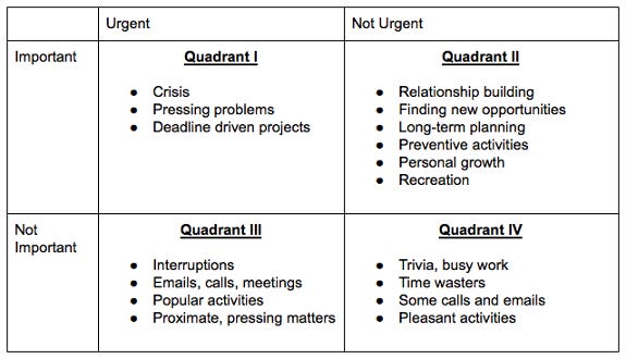 In both examples, you want to be spending most of your time in quadrant two. It’s a simple concept to understand, but applying it is very difficult.
